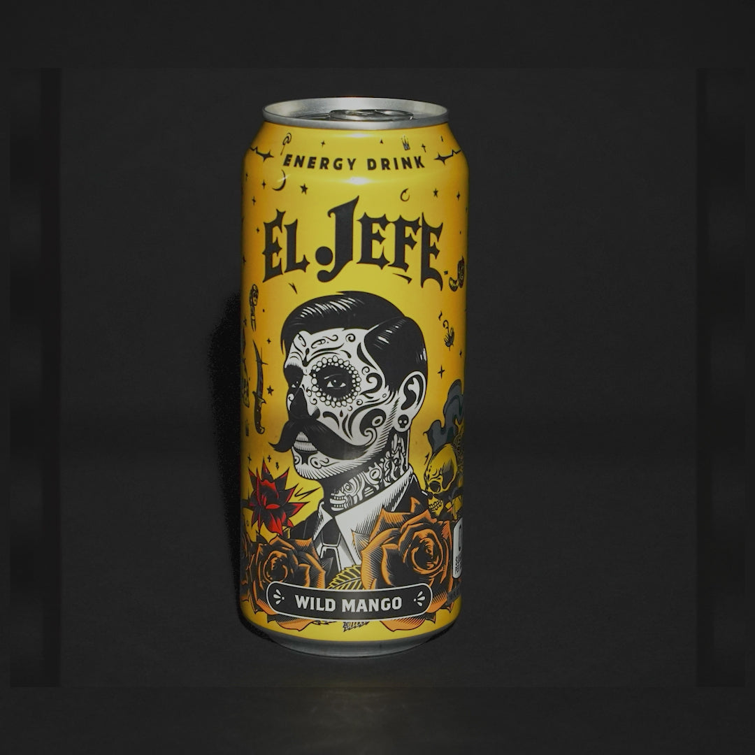 Collection of El Jefe energy drink cans in various flavors on a black background